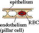 The secondary lamellae (thin, leaf-like protrusions from the gill filament) are best described as a sheet of blood separated by an array of posts (the pillar cells) which keep the lamellum from ballooning, maintaining it one red blood cell thick. Only about 2 μm of tissue thickness separates the water from the blood stream. Any increase in this distance will decrease oxygenation, e.g., gill tissue hyperplasia (thickening of the gill tissue) or increase mucous coating. Because this tissue thickness is so slight, often koi under great stress, especially from over handling, will seep blood from their gills.